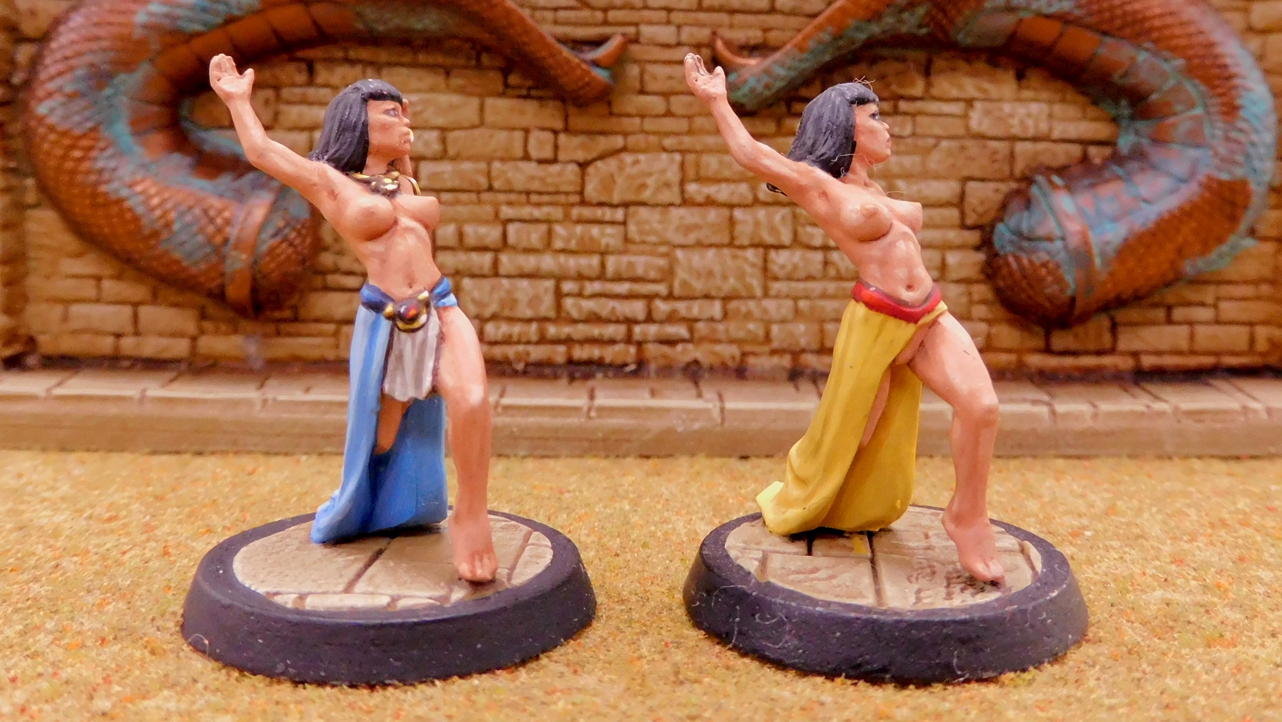 Two exotic dancers for the court. One has jewelry and a loin cloth where the other lacks both.